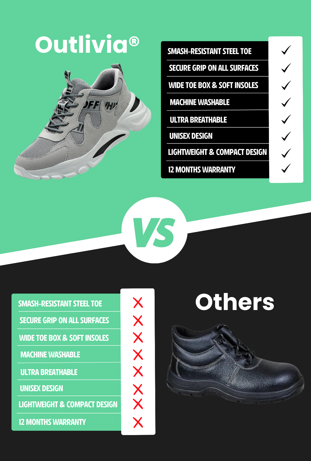 Designed with a breathable and ultra-lightweight build, Outlivia® ComfortCraft Safety Shoes offer versatility for all seasons, providing a perfect grip both inside and on various surfaces for stability and confidence with every step.